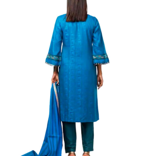Blue and green textured viscose Kameez with green embroidery. Comes with green viscose Shalwar and Matching printed viscose Dupatta.