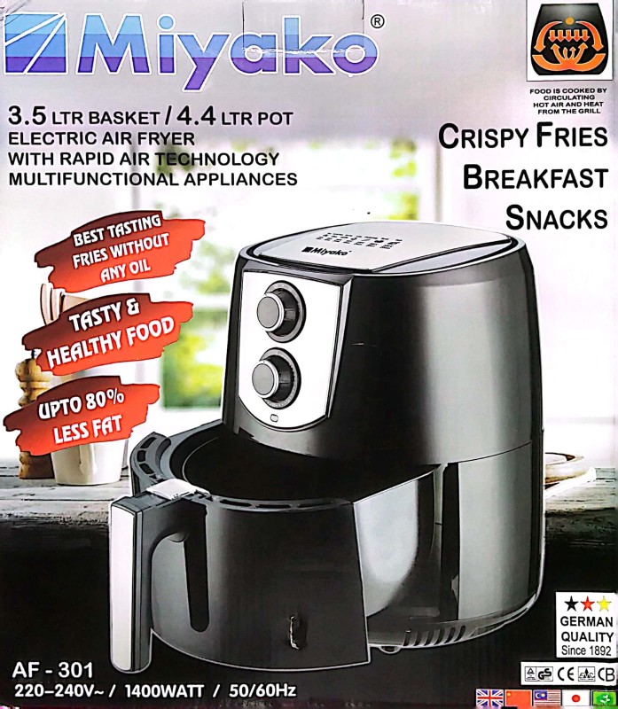 The Miyako Air Fryer AF 301 (3.5 liters) is a kitchen appliance that utilizes hot air circulation to cook food, providing a healthier alternative to traditional frying methods. Here are some features you might find in this model:
